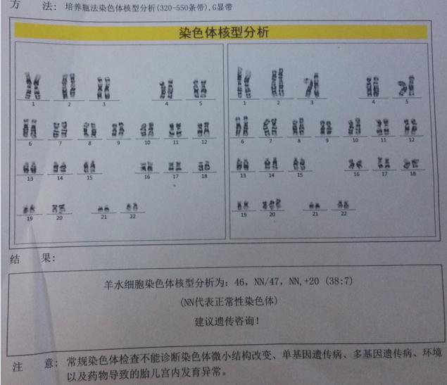 羊水细胞染色体核型分析为:46,NN/47,NN,+20(38:7),需要做脐带血检查吗 点击展开 匿名用户 2013-12-23 23:10 为您推荐: 其他回答 病情分析: 由于每个医院的实验设备, 指导意见: 试剂不同,正常参考值也有一定的差异,你的检查结果,建议咨询你的经治医生。 种凌丝_IyuJ 2013-12-24 08:01 相关问题 羊水细胞培养染色体检查核型分析:46,XN,13S+(G显带,约320条带)是什么意思,是个男孩 唐氏筛选 21染色体 1/50,但已经5个多月超过20周了,过了羊水穿刺时间了,还能怎么检查? 医生你好,我羊水穿刺结果是,羊水细胞染色体(G显带320条)47,□□,+21这个结果是什么意思?