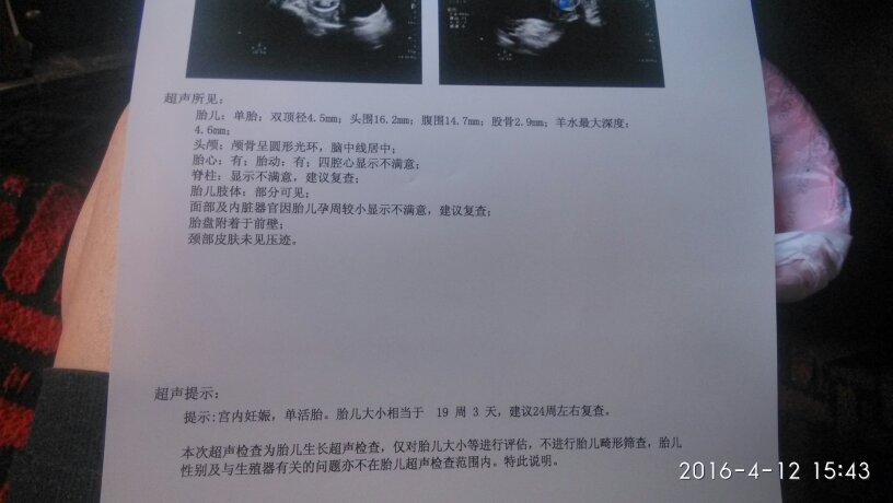 请问懂医学的和女性同胞们,我怀孕后第一次去检查,今天去人民医院b超,然后根据里面怀孕时间,大家看看 请问懂医学的和女性同胞们,我怀孕后第一次去检查,今天去人民医院b超,然后根据里面怀孕时间,大家看看前一大段文字说的不满意要不要担心啊,后段文子说建议24周的时候再次复查,可是朋友都说别检查多了堆宝宝不好 点击展开 匿名用户 2016-04-12 15:43 推荐回答 别担心崭脂敲,是急香胎儿太小,看不太清楚,所以说不满意,还有医生怎锈饥么说 匿名用户 2016-04-12 15:48 宝宝知道提示您:回答为网友贡献,仅供参考。 为您推荐: 其他回答 你不去才是对的宝宝不负责 匿名用户 2016-04-12 15:51 检查 匿名用户 2016-04-12 15:44 相关问题 女性怀孕后多长时间反应最明显,啥时候做B超才合适 怀孕多长时间可以去做B超可以看见宝宝 怀孕后有什么症状?多长时间可以在B超上看到?