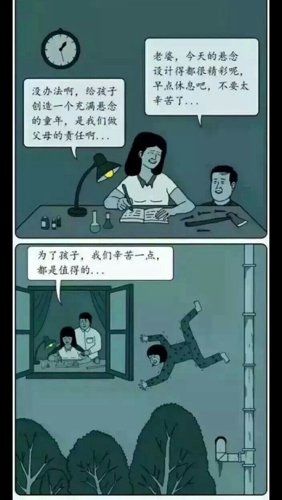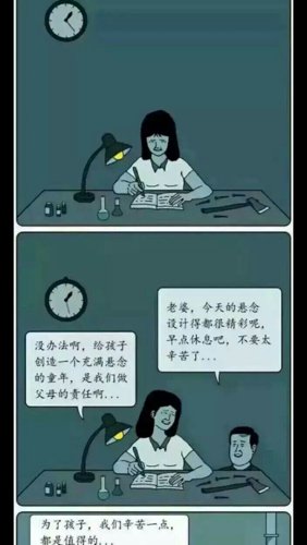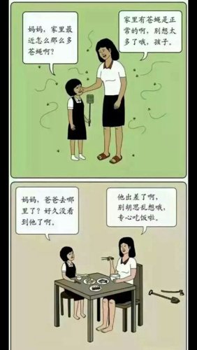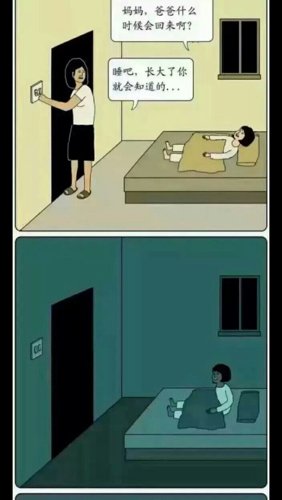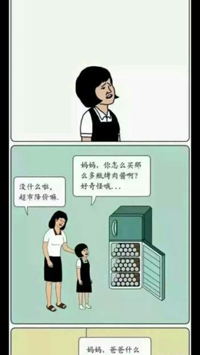 前三个图是一个故事,妈妈真的杀了爸爸,烤肉酱不会放在冷冻室里,除非是会坏掉的人毫它肉,后两张图愿凡片中的躬斯垃妈妈是前三张图片的女儿,最后一张图的女儿的睡衣颜色已经变了!最后一张图的悬念的童年的意思是,大概女儿都不会知道为什么妈妈要把她钉在墙上了(爸爸不知道~)因为妈妈的心里已经变态了~