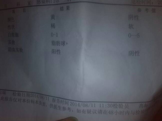我把验的大便拍下来请医生帮我看下,求求看看是什么情况,需要吃什么药 我把验的大便拍下来请医生帮我看下,求求看看是什么情况,需要吃什么药 点击展开 野蛮 小女人° 2014-08-19 17:03 为您推荐: 其他回答 这是肠胃消化不好的,不需要担心,注意喂养,可加助消化药物调理就可。 yh918 2014-08-20 08:21 没有问医生吗,大便好像不正常 ℡﹏安郁染☆づ 2014-08-19 21:29 相关问题 大便有饶虫,去医院验大便又说一切正常 验出来没有虫子 晚上睡觉肛门总是痒痒的 医生又不给开药吃 我 宝宝便秘,大便解不下来,医生开了药,吃了没效果,怎么办呢? 从宝宝出生到现在一直拉稀,头几天吃的药好了结果都三天没大便了,没事吧?怎么办啊求医生解答