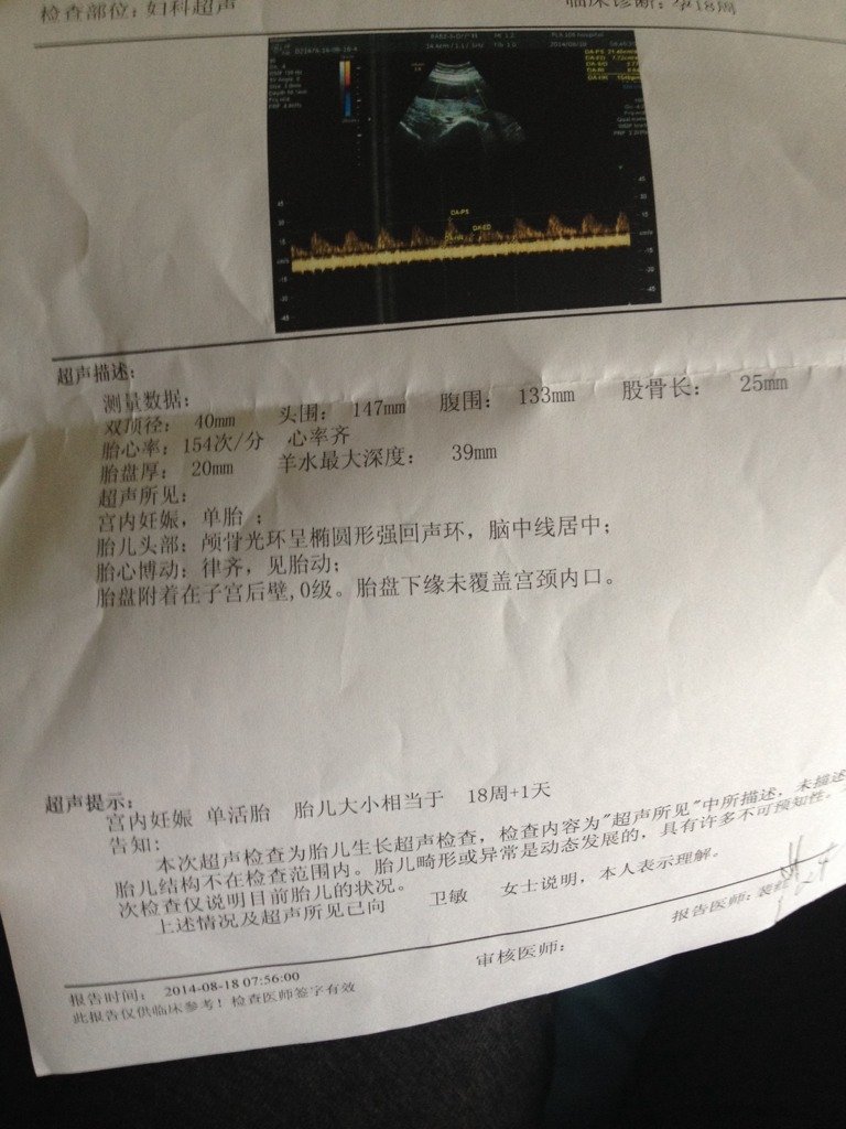 刚刚18周的B超单子,宝妈妈们猜猜是男宝还是女宝? 刚刚18周的B超单子,宝妈妈们猜猜是男宝还是女宝? 点击展开 乐观的misswei 2014-08-18 09:39 为您推荐: 其他回答 这个不能看出来的 栩栩宝贝专属 2014-08-18 15:54 这是看不出来的,不管生男生女都是自己的不是吗? 紫蔓妈。 2014-08-18 10:09 这个是看不出宝宝性别了, 宝贝儿萱萱 2014-08-18 09:45 看单子是看不出来的。 日出、陪你等 2014-08-18 09:44 这个看不出来的 要照的时候看宝宝器官 梦雅馨 2014-08-18 09:42 加载更多 相关问题 宝妈们问一下你们怀男孩的时候b超单子胎儿的心跳都是多少啊!