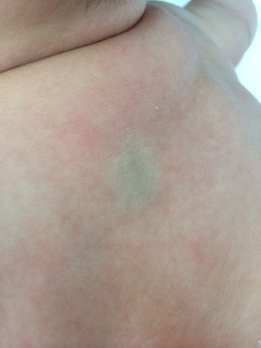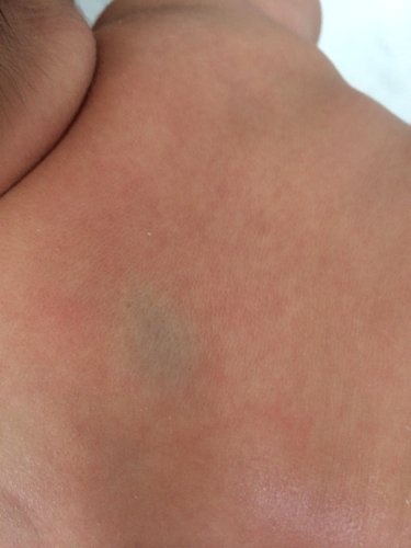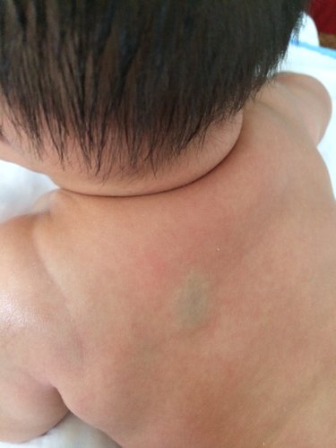 女孩,92天,大概不到两个月时发现宝宝背后有一块青的,当时以为是撞哪了 后来一直不消,感觉又像胎记