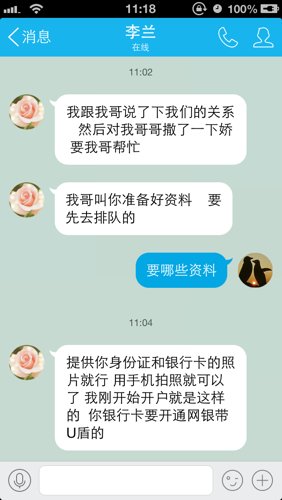 一个女孩子要我做现货 提供 身份证跟银行卡 她哥也是做这个的 说把资料提高给他就好,说有内部 一个女孩子要 我做现货 提供 身份证 跟银行卡 她哥也是做这个的 说把资料提高给他就好,说有内部行情,知道什么时候买卖 是真的吗 点击展开 匿名用户 2016-04-26 11:19 满意回答 骗人的 匿名用户 2016-04-26 11:19 宝宝知道提示您:回答为网友贡献,仅供参考。 为您推荐: 其他回答 你好 这是开户申请需要的证件。入金操作的话 最好选择正规合法的大平台。 匿名用户 2016-04-26 11:22 相关问题 一个女孩子要我做现货 提高 身份证跟银行卡 她哥也是做这个的 说把资料提高给他就好,说有内部 急急急,前两天在微信上买了尿不湿 拍下1元还包邮,有点害怕是被骗了,身份证银行卡 手机号 2015年超生罚款的最新政策出台,小孩己落户口计生部门在追缴罚款,说不交罚款就冻结银行卡,和身份证