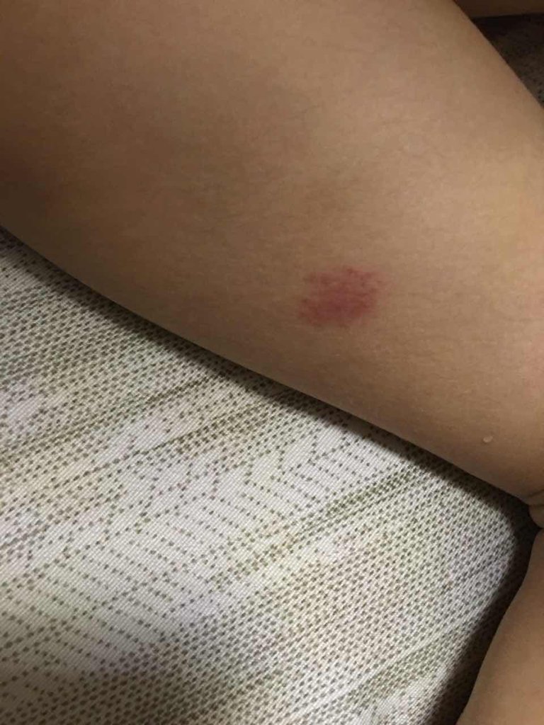5月21日,我发现宝宝脚上有类似蚊子叮咬的红色包包,于是给她擦了蚊虫叮咬的药,今天5月25日,我发