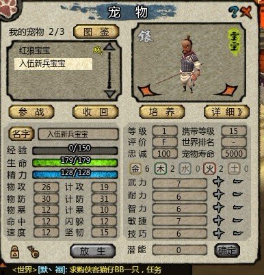 宝宝携带是看携带等级和宝宝本身的等级。 他的携带等级是15,那么你就只能到15级才能带上这个宝宝,并且带上后宝宝是1级。 还有一种可能就是你的宝宝等级大于你的等级,例如,你宝宝是15级,而你只有14级,那就带不起!只能你的级数超过宝宝,不能宝宝的级数超过你。 入伍新兵加点一般都是先全部加武力,再加耐...
