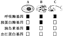如图为某哺乳动物体内三种细胞的部分基因及它们的活动状态(“■”表示基因表达,“□”表示呼吸酶基因基