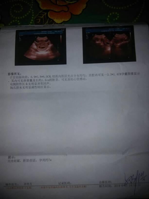 按照你说,末次月经是5月1号,现在应该是7周左右,B超的检查孕囊大小也符合孕周。