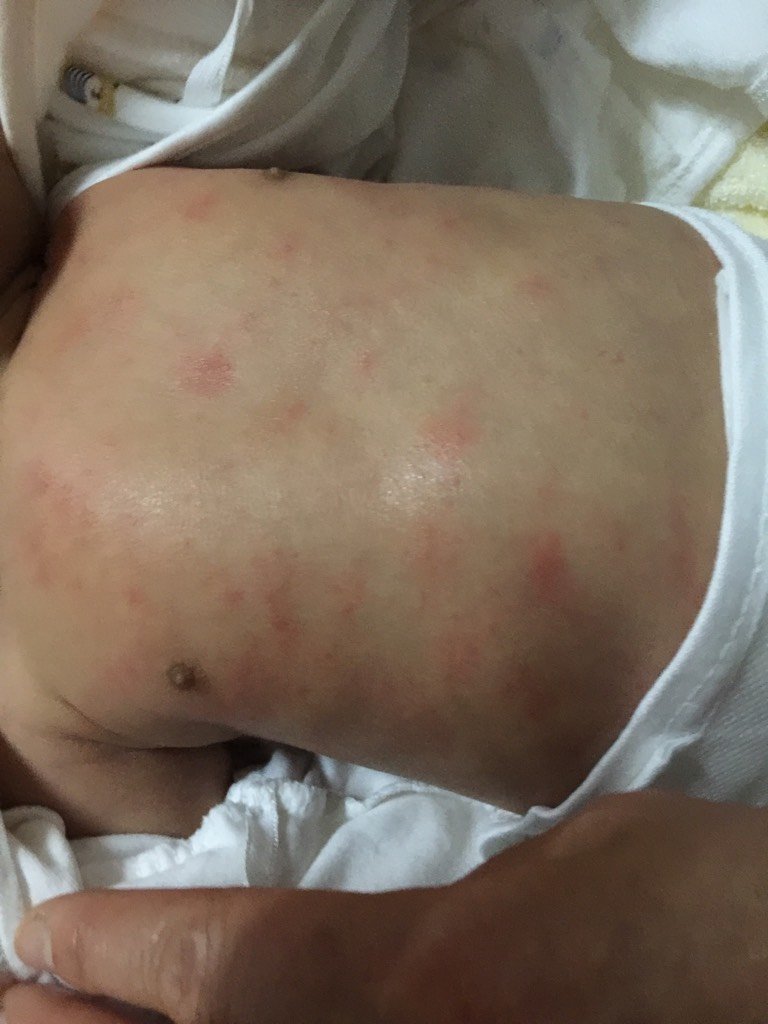 宝宝身上出现红斑,屁股和腿上没有,前一天洗澡时就一点,第二天洗完后很明显,洗澡后过几个小时会好点