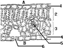 在上述图示中,A为正面凡耗;B为背面;1为上表皮;2为叶肉的栅栏组织;3为叶肉的海绵组织;4为下表皮;5为叶脉;6为气孔. (1)在叶的结构中,靠近上表皮的叶肉为栅栏组织,细胞排列比较紧密,含有的叶绿体较多,颜色较深;靠近下表皮的是叶肉的海绵组织,细胞排列比较疏松,含有的叶绿体较少,颜色较浅.细胞排列的这些特点,有利于叶片进行光合作用. (2)气孔是由两两相对而生的保卫细胞围成的空腔.气孔的张开和闭合受保卫细胞的控制.当气孔张开时,叶片细悼内的水分吸收热量变成水蒸气,经气孔扩散到外界空气中去.因此,气孔是植物体蒸腾失水的“门户”,也是植物体与外界进行气体交换的“窗口”. (3)叶脉具有支持和输导作用,能够运输叶片中的水分和无机盐,属于输导组织. (4)植物的叶片上有许多气孔,气孔主要分布命崇灿在叶片的上下表皮.在叶片的结构中,叶表皮细胞具有保护作用,用来保护叶的叶绿体,不用进行光合作用,所以上、下表皮都不含叶绿体,不能进行光合作用,这也是与根尖细胞不同的地方. (5)由于在叶片的结构中,下表皮的气孔比上表皮的气孔多,所以,当叶片落下时,背面朝上.故答案为:(1)叶绿素(或叶绿体);有利于光合作用(2)气孔;保卫细胞(3)叶脉;输导(4)4;叶绿体(5)A;栅栏组织在上(或上表皮气孔数较少)