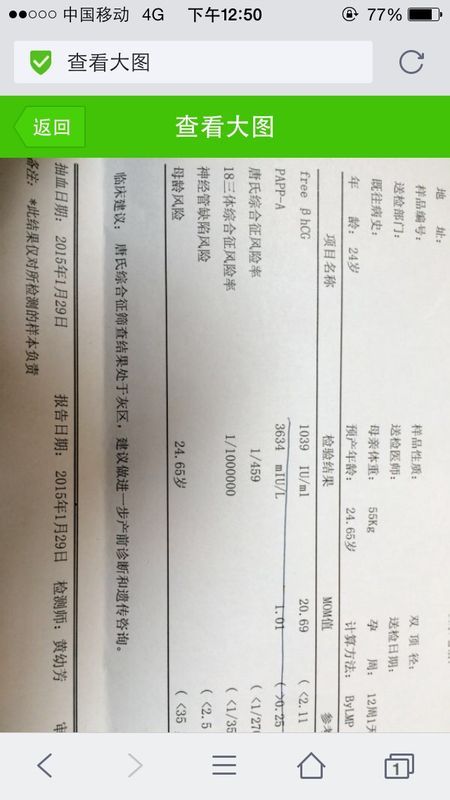 问:我11周加4天做产前筛查想叫医生帮我看看我这报告单free hcg和PAPP-A值都那么高风险 大吗 点击展开 136*****959_rGGY 2015-01-31 13:36 为您推荐: 其他回答 你好,是比较危险,建议你做无创DNA或者等到二期唐氏筛查再看看。具体还是要专科医生给你解答比较好。 碰碰914 2015-02-01 20:55 相关问题 怀孕4个多月,产前筛查报告结果,free-hcg阝结果19 6单位ng/ml MOM值2 19 请 产前在医院检查还需要做b超么?我37周加b超的时候宝宝有6斤6两,那个医生给我摸肚子,说宝宝头蛮大 姐妹们帮我看看,报告单上说未见明显黄囊及胚芽,现在五周加了,亲,是不是有问题