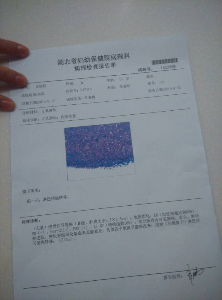 妈妈得了乳腺癌,前几天做了手术,切除了乳房,现在病理报告出来了,想问一下情况是不是很不乐观,拜托了 妈妈得了乳腺癌,前几天做了手术,切除了乳房,现在病理报告出来了,想问一下情况是不是很不乐观,拜托了。 点击展开 匿名用户 2014-09-23 21:20 为您推荐: 其他回答 不是很好的,这个已经腋下淋巴转移了,不过手术以后还要随访。至于要不要放化疗看你医生给你的建议吧 匿名用户 2014-09-27 06:29 相关问题 我查出乳腺癌前几天做的右乳房切除,下面是我的病理报告,还有个三项没出来,请医生给点建议,像我这个情 乳房要不要开刀 乳腺癌我的乳房摸上去一直都有硬块会移动,可最近右边的乳头有时候会痒 这样的政治会不会是乳腺癌
