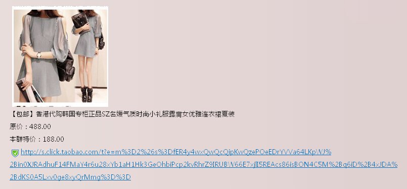 在QQ群推广淘宝宝贝链接 请问用什么软件能做到以下效果 点击展开 匿名用户 2014-08-04 13:11 为您推荐: 其他回答 这样一般还是挺有困难的,因为如果这样发的话很有可能会被群主踢出群的,这样做的广告实在太明显了。。。 匿名用户 2014-08-04 13:29 相关问题 想在手机QQ群里发送淘宝宝贝链接,怎么发啊? 等待发布的淘宝宝贝上面可以写自己的QQ号码么? 怎么把淘宝宝贝上传到QQ空间