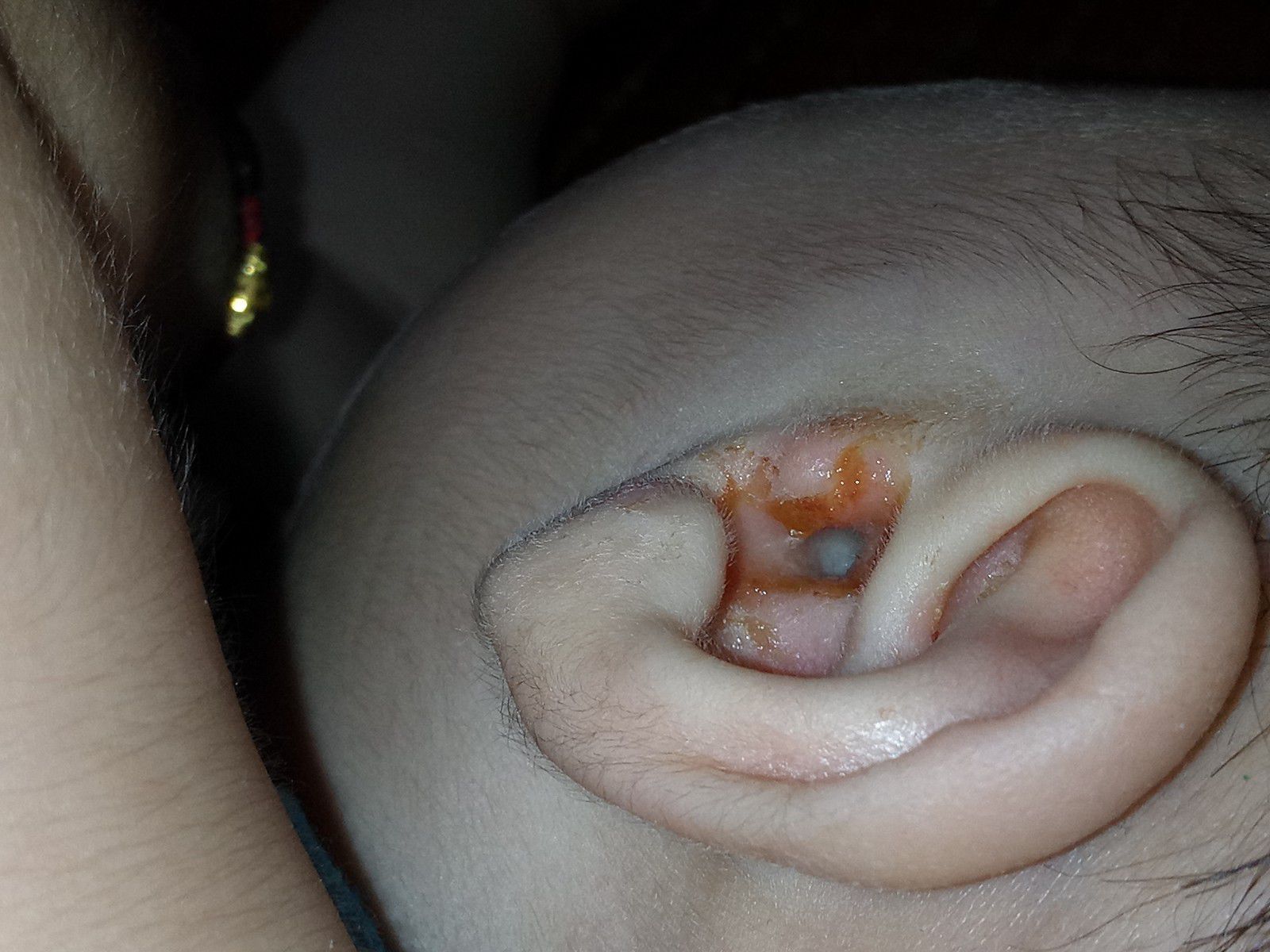 你好,这个可能是中耳炎,建议你尽快带孩子去医院进行诊治,对症下药。如果婴幼儿仰卧位吃奶,由于幼儿的咽鼓管比较平直,且管腔较短,内径较宽,奶汁可经咽鼓管呛入中耳引发中耳炎。以下是化脓性中耳炎的病发症状,你可以对照参考下。 (1)急性化脓性中耳炎 由化脓性细菌感染引起的中耳炎症,其症状主命查要是耳痛、流脓。小儿的全身症状比成人明显,可有发热、呕吐等。严重的并发症有颅内并发症,如脑栋菜膜炎、脑脓肿等。其他并发症有迷路炎、面神经麻痹等。 (2)慢性化脓性中耳炎 是指中耳黏膜、骨膜或深达骨质的慢性化脓性炎症。本病在临床上较为常见,常以耳内间断或持续性流脓、鼓膜穿孔、听力下降为主要临床表现,严重时可引起颅内、颅外的并发症。 ①全身症状 轻重不一。可有怕冷、发热、乏力、食欲减退。小儿全细今菜身症状较重,常伴呕吐、腹泻等消化道症状。鼓膜一旦穿孔,体温即逐渐下降,全身症状明显减轻。 ②耳痛 耳深部疼痛,逐渐加重。如搏动性跳痛或刺痛,可向同侧头部或牙齿放射。吞咽及咳嗽时耳痛加重,耳痛剧烈者夜不能眠,烦躁不安。鼓膜穿孔流脓后,耳痛顿减。 ③耳流脓 是本病的主要症状,可为黏液、黏脓或纯脓性。非危险型流脓较稀薄,无臭味。危险型流脓虽不多,但较稠,多为纯脓性,并伴有异臭味。 ④听力减退及耳鸣 开始感耳闷,继则听力渐降,伴耳鸣。耳痛剧者耳聋可被忽略。有些患者可伴眩晕,穿孔后耳聋反而减轻。 ⑤耳聋 轻重不一,因多是单耳发病,易被忽视。一般为传导性聋。