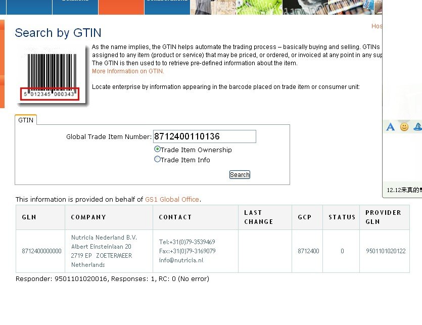 条码不是用来辨别真伪, 查出结果也不是英语, 一家荷兰奶品公司名称地址和电话电邮.