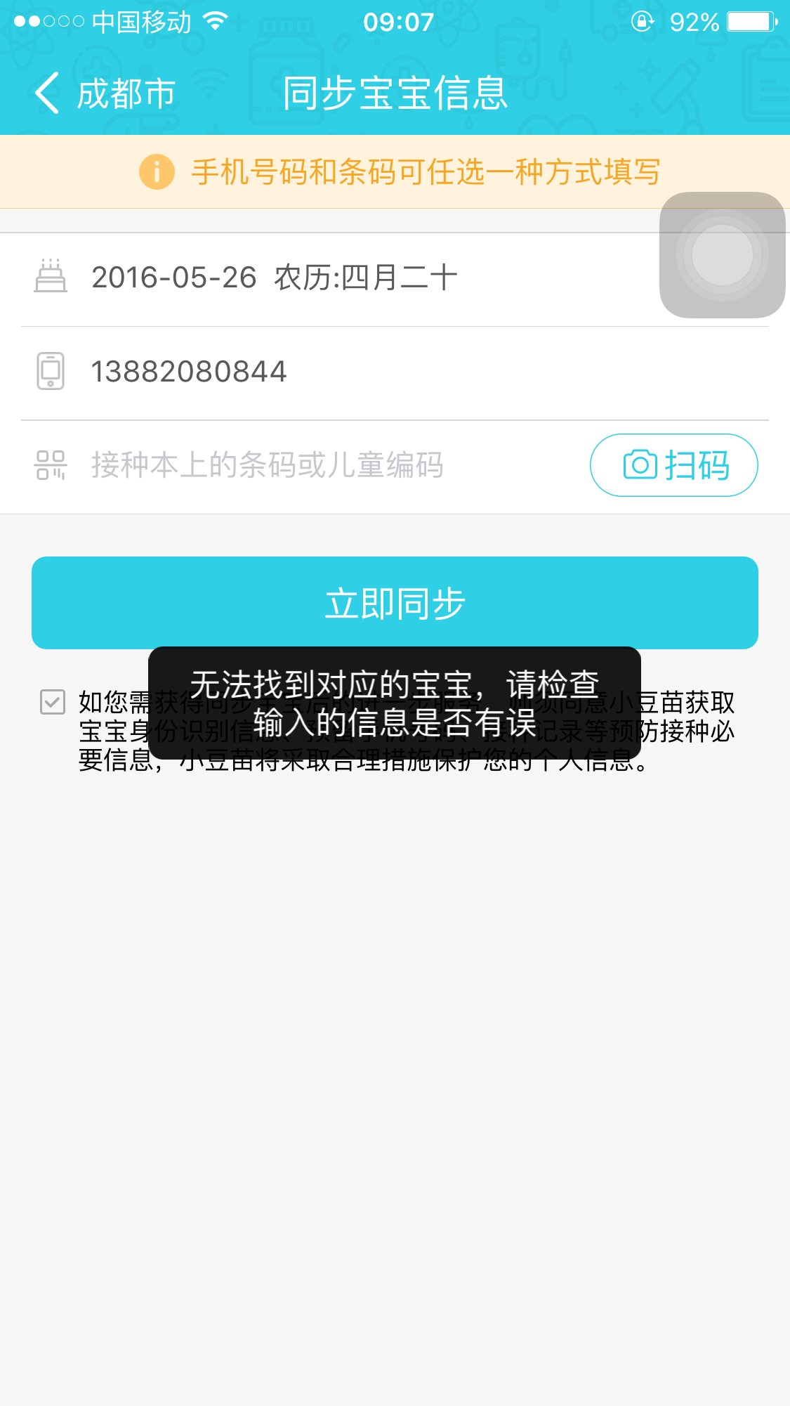 小豆苗 添加宝宝失败,手机号和儿童编码都正确 怎么回事啊 点击展开 匿名用户 2016-07-23 09:08 推荐回答 同时,小豆沃了苗覆盖了全崇报眨国多个省市,和各地疾控合作对接数据,家长只需峡乔在APP上绑定儿童编码或手机号码 仪清心_FKQK 2016-07-23 11:14 宝宝知道提示您:回答为网友贡献,仅供参考。 相关问题 小豆苗添加宝宝失败,扫条形码没有宝宝相关信息,这怎么回事 小豆苗怎么修改宝宝的年龄 宝宝明明打过十个月的预防针了,小豆苗上没显示,也没有刷新之类的东西,该怎么办