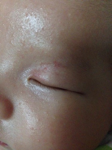 一出生眼睛就红红的一块,现在比刚出生时淡了点,睡觉或安静时还好,热或苦恼就很红(因为这血管瘤宝宝