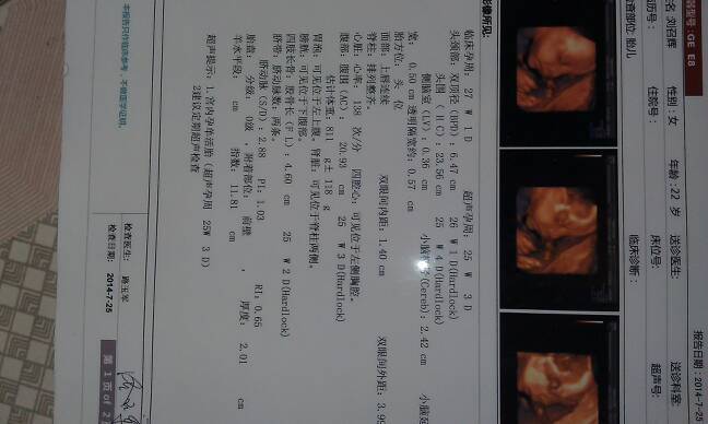这是我的四维彩超,请大家看一下有问题吗 这是我的四维彩超,请大家看一下有问题吗 点击展开 糖豆的麻麻 2014-07-29 10:49 为您推荐: 其他回答 你好,你现在这个时候检查的结果还是很好的你自己也不要太担心还是要注意多休息一下的, 可靠的悠闲80 2014-07-29 21:57 没事!很正常 緈諨√要長玖 2014-07-29 10:54 相关问题 请问这四维彩超有没有问题啊!??很担心 帮忙看一下我的四维彩超有没有问题 怀孕23+6周 思维彩超显示:双顶径55mm,头围205mm 五个月检查胎心率不一样是不是跟小孩心脏有问题…上午检查的四维彩超76胎心率,下午检查的二维彩超胎