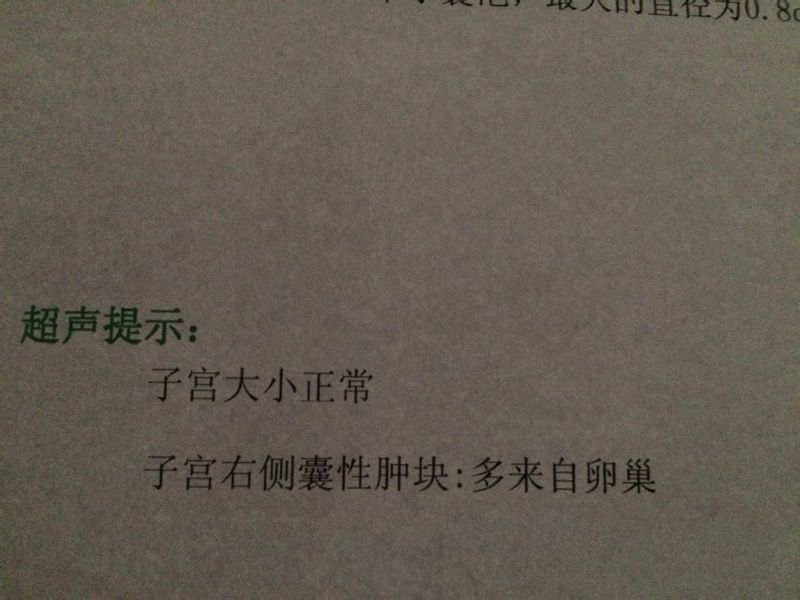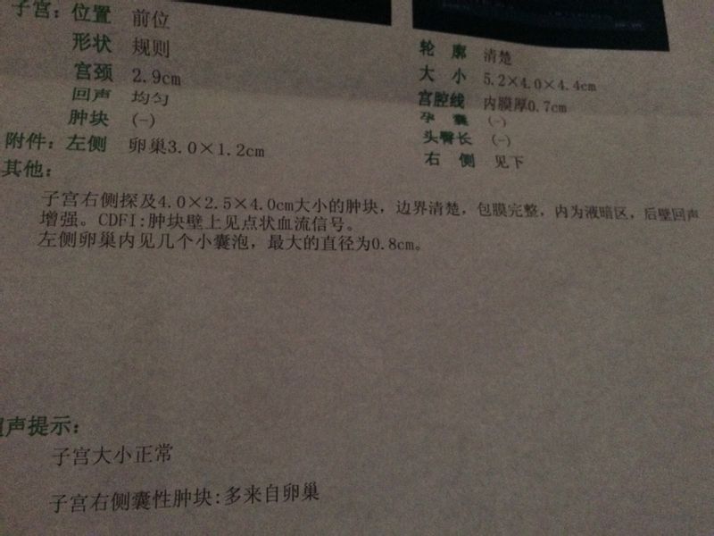 子宫右侧探及4.0*2.5*4.0cm大小的肿块,边界清楚,包膜完整,内为液暗区,后壁回声增强 C