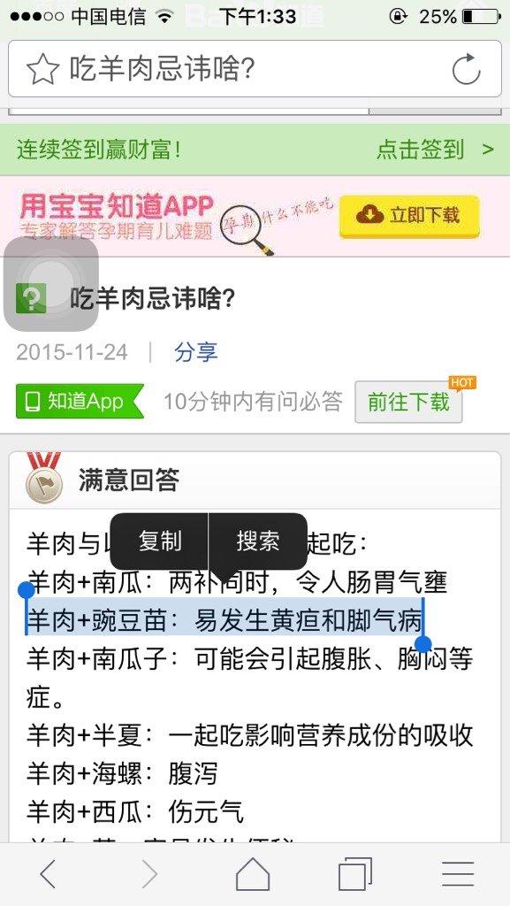 刚生完孩子坐月子,百度说羊肉和豌豆苗不能一起吃,说同食易发生黄疸和脚气,我今天吃了会不会有问题啊 刚生完孩子坐月子,百度说羊肉和豌豆苗不能一起吃,说同食易发生黄疸和脚气,我今天吃了会不会有问题啊,能喂奶吗好担心啊 点击展开 189*****006_ttTM 2015-12-22 13:36 为您推荐: 其他回答 应该没事的 ①か伊 2015-12-22 18:46 一次应该没事 芃児 2015-12-22 16:49 吃一次没事的 轩轩BABY妈妈 2015-12-22 15:49 这个不知道,但是百度说的不一定都是真的 邓继轩 2015-12-22 15:28 不清楚,, 小宇茜 2015-12-22 15:04 加载更多 相关问题 坐月子期间有脚气可以用药水泡脚呢?宝宝吃的母乳有没有影响啊 刚生完孩子正在坐月子喂奶,可我脚气很严重,怀孕时候不敢治,现在可以用外用药了吗? 坐月子能用脚气药吗?对孩子有危害吗?