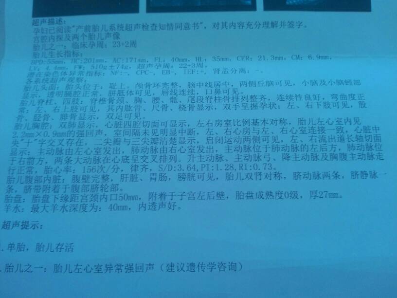孕23周双胎两个宝宝左心室都有异常回声,一个是2.2*0.9mm一个是2.6*1.5mm潜在染色体 孕23周双胎两个宝宝左心室都有异常回声,一个是2.2*0.9mm一个是2.6*1.5mm潜在染色体异常指标nf-cpc-eb-ief+肾盂分离-是不是宝宝有问题,医生说双胎没法做唐筛,怎么办,说有换唐氏的风险,怎样排除么,几率大不大? 点击展开 150*****181_OfuI 2014-08-14 21:04 为您推荐: 其他回答 这到没有 追忆_dbjj 2014-08-15 13:06 宝妈可以做微创 绚丽多彩的烟花 2014-08-15 03:22 我答复不了你,不过我会祝你们母子平安的。 真真假假_cewn 2014-08-14 23:53 我怀我家双胞的时候倒是做过唐氏筛查了 追忆_dbjj 2014-08-14 23:28 相关问题 怀孕25周胎儿左心室内强回声斑直径2,4mm怎么办与染色体分变有关吗? 孕23周双胎两个宝宝左心室都有异常回声,一个是2 2*0 9mm一个是2 6*1 5mm潜在染色体 胎儿左心室可见一点状强回声,大小约0 3*0 3cm,是怎么回事啊,医生建议做染色体检查,那是怎么
