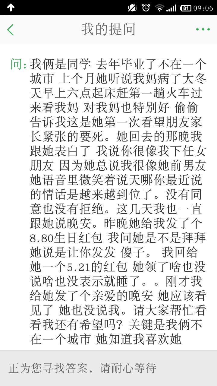 她喜欢你应该是事实,但是她一定有一定原因暂时不能给你任何回答,或许可以来一次短暂的谈话,对彼此都好!