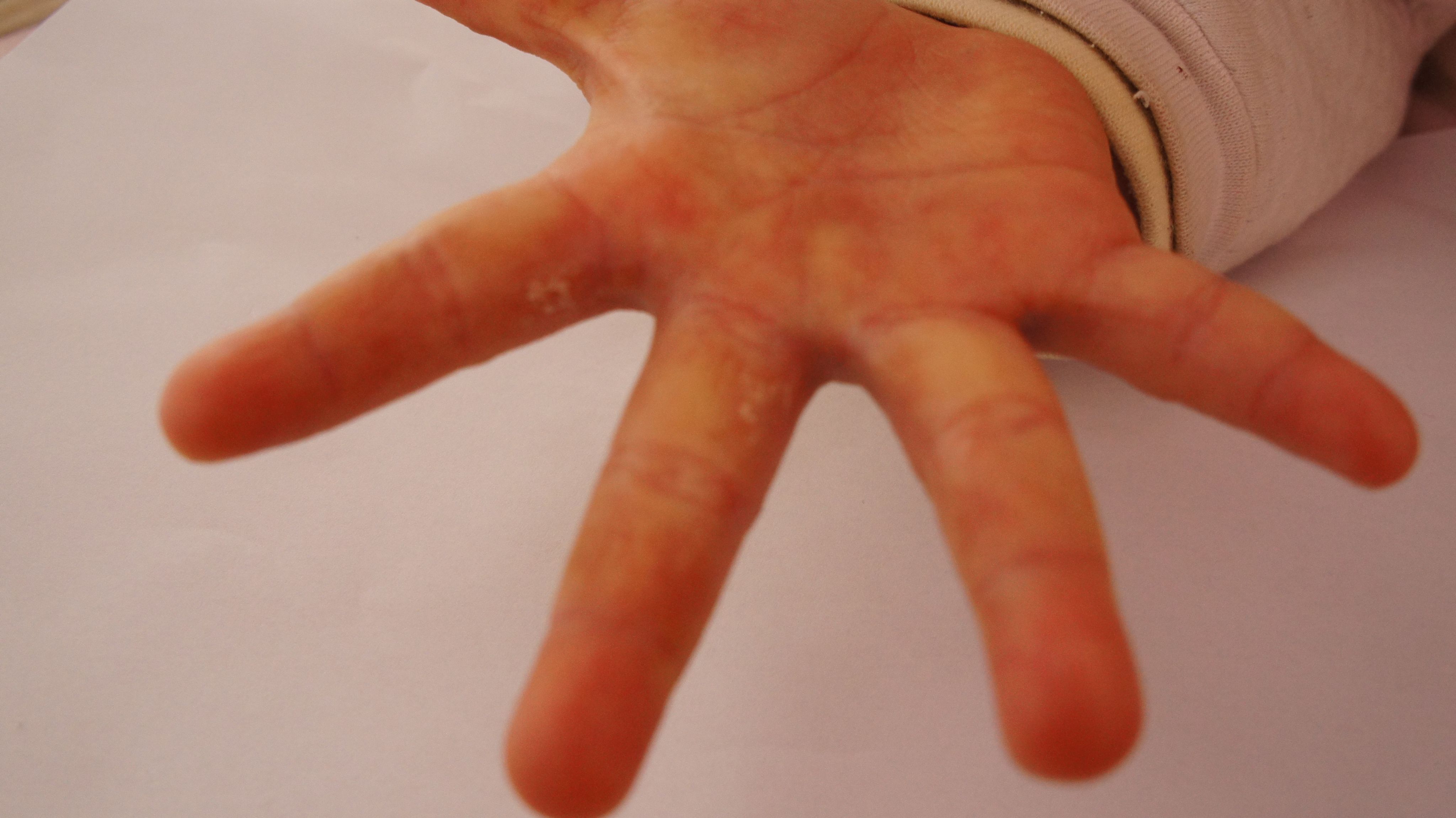 宝宝2岁10个月,双手手背长小疹子,手心长的红斑比较大发硬,热的时候痒