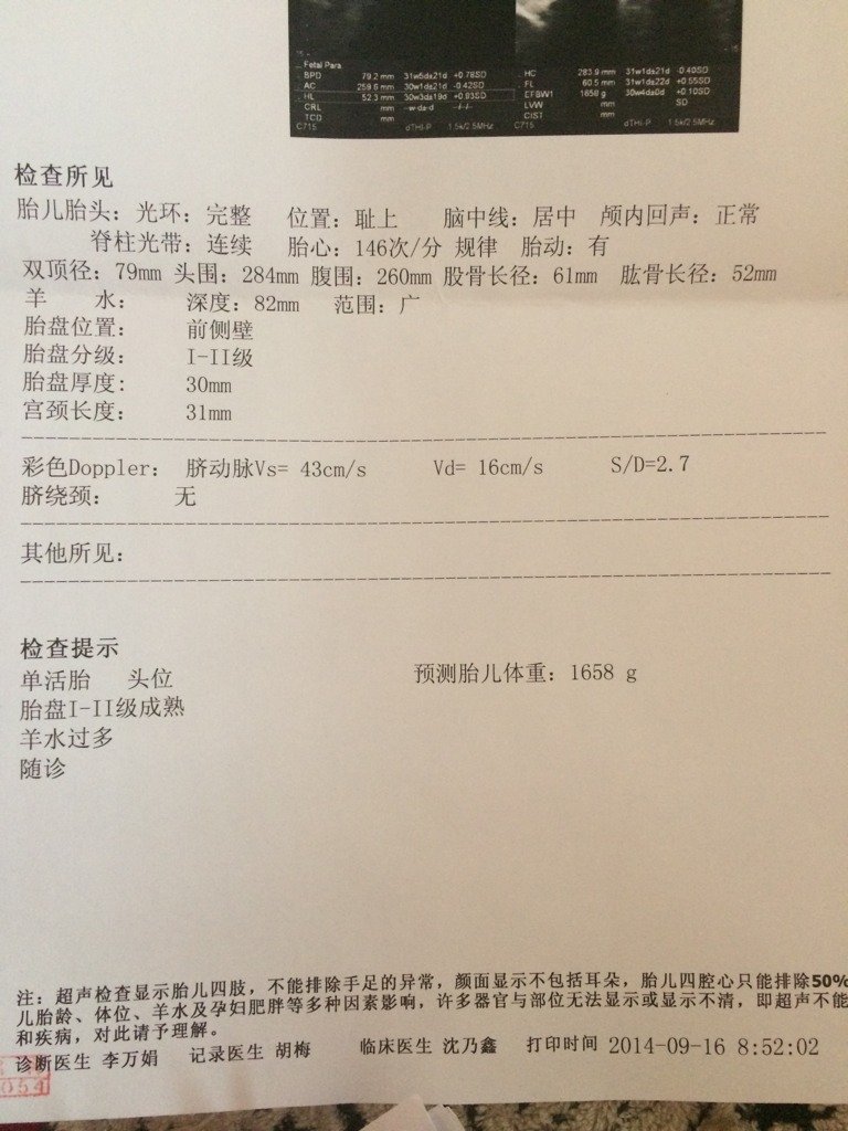 检查说宝宝头大,胳膊腿长,羊水过多…!羊水过多是啥情况?是好是坏…? 点击展开 曹、冭冭 2014-09-16 14:50 为您推荐: 其他回答 在孕期羊水过多注意休息,低盐饮食。可服利尿剂双氢克脲塞,或健脾利水温阳化气的中药,注意预防胎盘早剥和产后出血的。 hbwxsxl 2014-09-16 14:51 相关问题 请问怀孕36周头有多大?腿有多长?胳膊有多长?头8、3正常吗? 怀孕33周,今天和老公吵架了,还用胳膊使劲捶打老公的腿,对宝宝有影响吗?会不会动了胎气啊? 我家宝宝快满月了,这几天睡觉的时候老是颤抖,胳膊腿,有的时候头也抖,是因为什么?