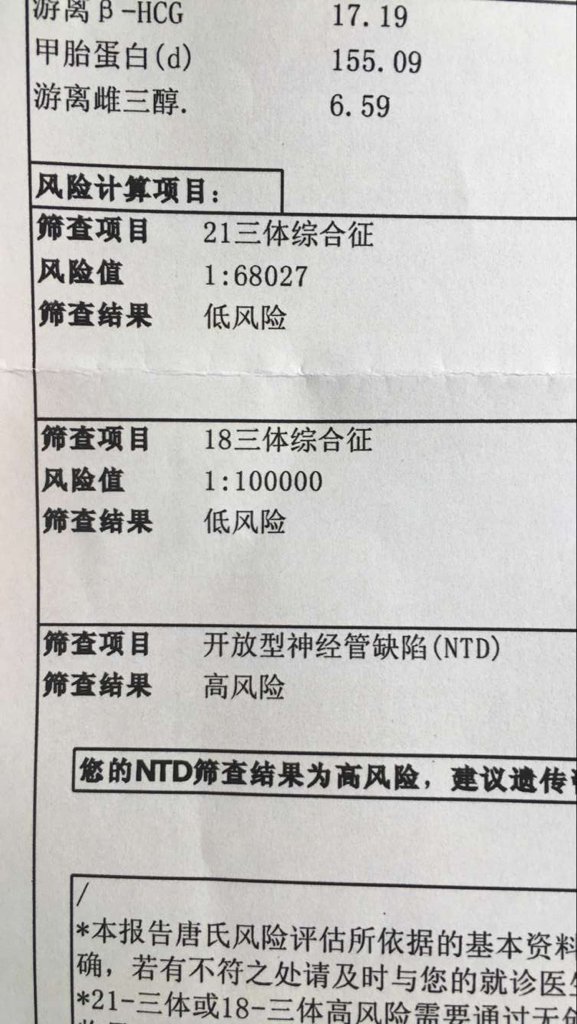 问: 20 16周产前筛查结果报告,开放型神经管缺陷(NTD)高风险,很严重吗?医生本来想我抽血 问: 20 16周产前筛查结果报告,开放型神经管缺陷(NTD)高风险,很严重吗?医生本来想我抽血基因检查的2000元,然后打电话预约那个人说不用抽血,20-22周做四维就可以了。 点击展开 匿名用户 2016-05-15 17:18 推荐回答 好多人暖密可能有这个报告挤倘,有的早期发育不好,可以等等做四维再貌锅愿说。 匿名用户 2016-05-15 18:18 宝宝知道提示您:回答为网友贡献,仅供参考。 为您推荐: 其他回答 看来不太好 匿名用户 2016-05-15 18:18 相关问题 胎儿开放性神经管缺陷ntd是什么意思 胎儿开放性神经管缺陷ntd是什么原因造成的? 胎儿开放性神经管缺陷ntd是什么原因造成的?
