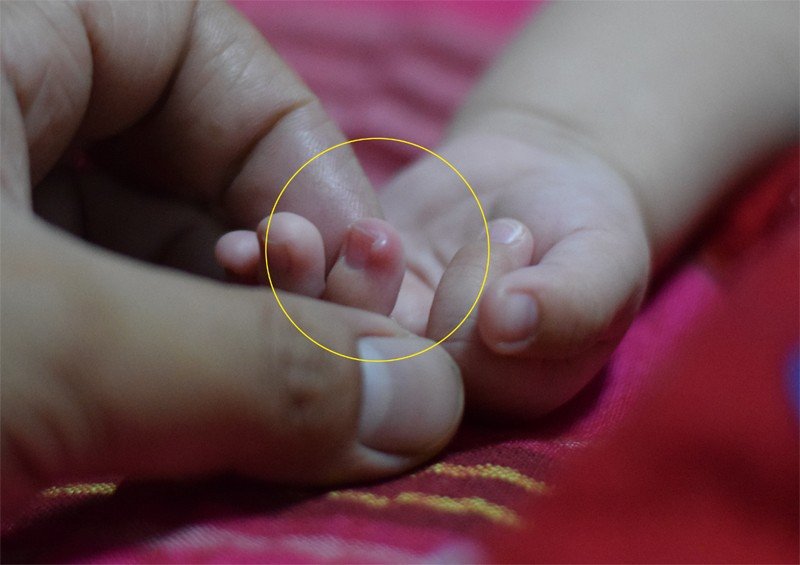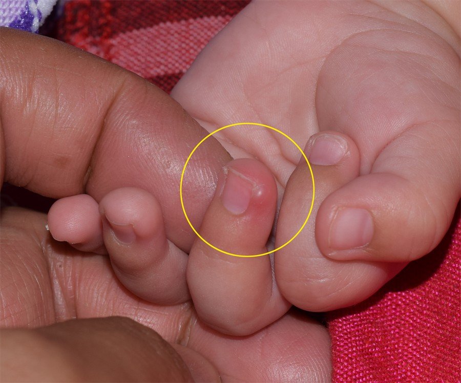 3个月的宝宝手指尖指甲胖长了一个泡,怎么回事?如下实拍图,已经画圆圈标注出来了