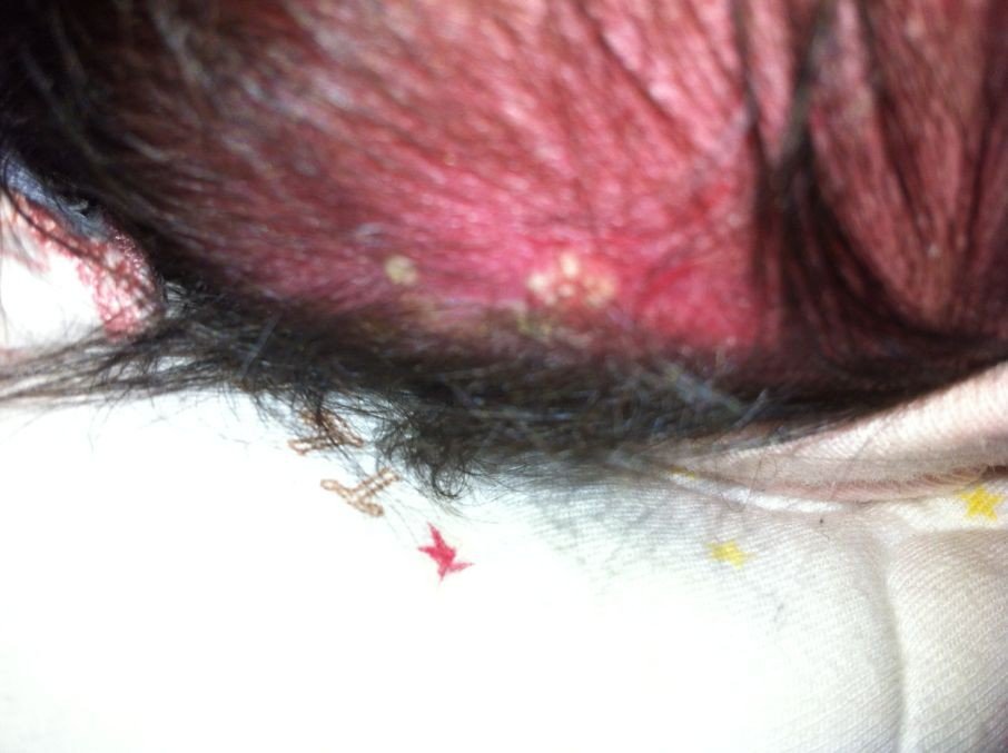 宝宝刚出生20天,头皮刚开始有发红 肿,后中心有跟青春期长的粉刺一样的东西,是什么了