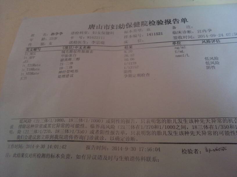 您的检查的结果还是比较好,都是在低风险的范围之内,因此您不要很担心,现在的时间就是要注意好好的保养,比如补充营养以及要补充叶酸和维生素,之后的时间就是要检查4维看看您的宝宝器官的发育的情况,一个月的时间检查一次