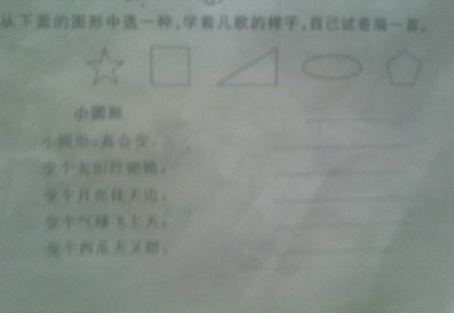 从下面的图形中选一种,学着儿歌的样子,自己试着编一首 点击展开 匿名用户 2014-08-17 21:38 为您推荐: 其他回答 正方形,四条边都一样,正正方方4个角, 匿名用户 2014-08-17 21:48 看不清 匿名用户 2014-08-17 21:39 相关问题 学儿歌的样子,用方形编一首 小土尘,小大尖,鱼羊鲜 照样子编儿歌 红气球,绿气球这首儿歌中气球的样子是