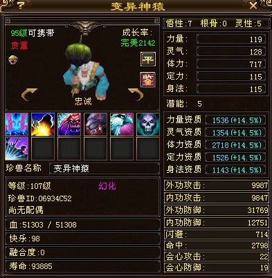 这个宝宝原始资质2139,双10的话资质可以达到是3903。 算法就是先用现在的2718除以1.145,再除以1.11,可以算出原始资质,因为猴子灵性5的时候加成是11%,算出原始资质以后乘以39.3%,再乘以灵性10的加成31%,2139*1.393*1.31=3903