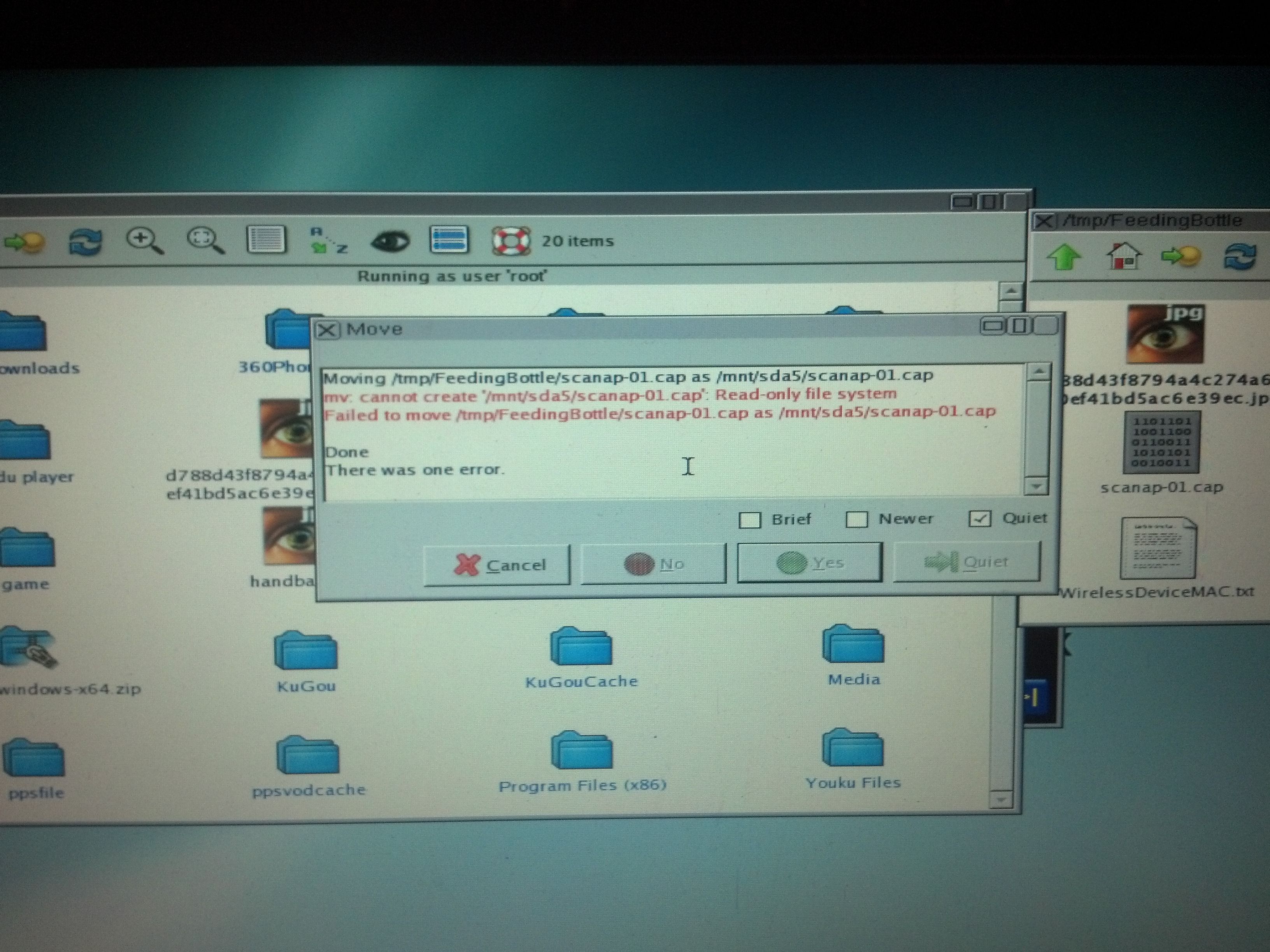 1、用beini奶瓶抓握手包后产生文件target_wpa_01.cap2、准备复制到mnt/sda5下但是就是不行3、网上搜了不少都说是直接拖,但是就是不行。4、本来还想替换密码本,也不知道怎么弄。见图