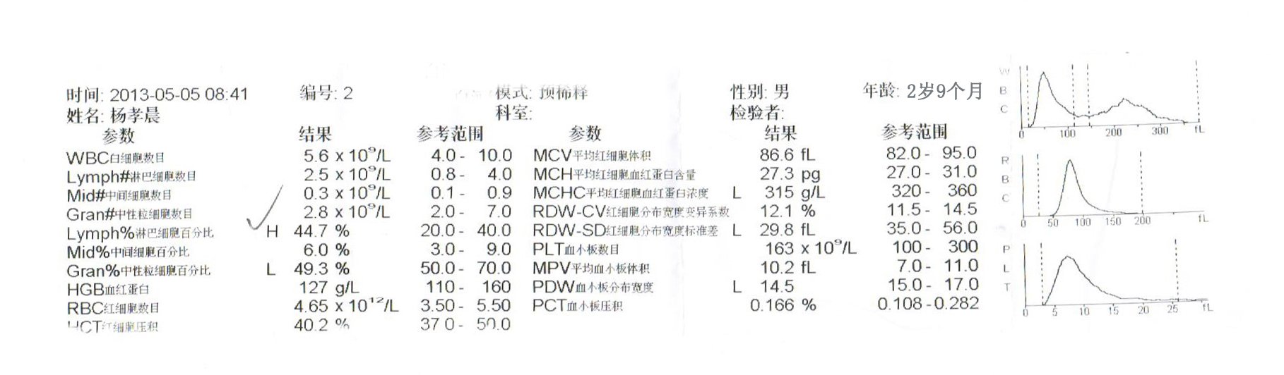 小孩子发烧,医生让做个化验单-验血如下图,帮忙看下小家伙是不是有点贫血?发烧已经好了 点击展开 匿名用户 2013-05-09 10:45 满意回答 不贫血 。发烧可能是病毒感染。 匿名用户 2013-05-09 11:00 宝宝知道提示您:回答为网友贡献,仅供参考。 为您推荐: 其他回答 不贫血呀,127g/L正常范围 斛海秋_4g6h 2013-05-09 10:52 相关问题 昨天感冒发烧了,感冒今天好多了,不发烧了,就是医生让我化验血常规说已经怀孕7个月贫血比较严重,怕生 宝宝的化验单出来了,医生说宝宝宝宝贫血结果是(88),还缺钙怎么办 请问一下医生这个化验单正常吗,除了有点贫血其他还好吗,是病毒感染还是细菌感染