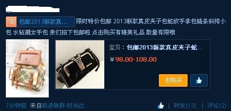 怎样在新浪微博上发布淘宝宝贝直接购买的微博? 就像这样的一个图! 点击展开 匿名用户 2013-11-01 10:33 满意回答 这是 最新的新浪淘宝版! 匿名用户 2013-12-19 17:14 宝宝知道提示您:回答为网友贡献,仅供参考。 相关问题 为什么在新浪微博中发的带有淘宝宝贝的链接都不能发,有些微博上还是有的啊 淘宝宝贝详情页发布了视频,可是为什么没有显示呢(不是主图视频,而且我已经购买相关服务了) 我的淘宝宝贝中为什么找不到了宝贝链接?出来的是分享到淘宝,分享到新浪,分享到人人