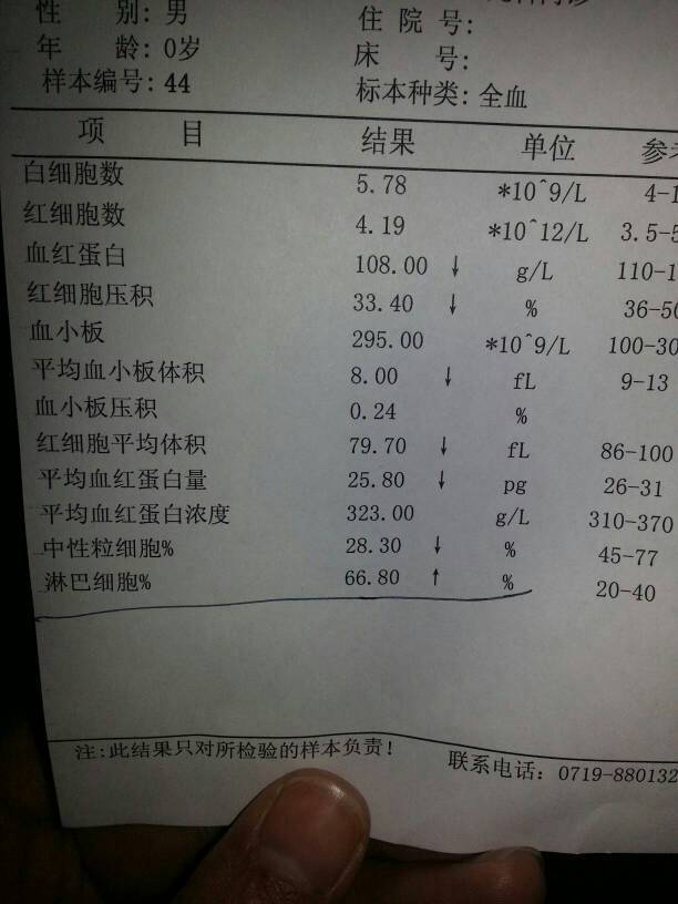 各位宝妈,帮忙看下,宝宝这样,需要治疗吗? 各位宝妈,帮忙看下,宝宝这样,需要治疗吗? 点击展开 煜杭妈咪 2014-11-29 19:42 为您推荐: 其他回答 几个月的孩子???没有太大问题,是不是感冒了?单纯来看,就是淋巴比例偏高,考虑病毒性感染。或者感冒。 mrlvxianliang 2014-11-30 21:43 怎么不问问医生呢 小妃 2014-11-29 20:10 还是听医生的吧, 多多宝贝! 2014-11-29 19:53 把结果拿给医生看就知道啦 多多宝贝! 2014-11-29 19:49 相关问题 四个月宝宝补钙吃什么好,各位宝妈推荐一下 会算的宝妈帮我看下宝宝现在有多重?谢谢! 哺乳期宝妈拉肚子会不会影响宝宝?该怎么治疗?
