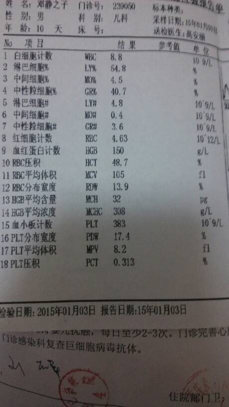 那个帮我看看我就宝贝男,出生20天的血常规正常嘛? 那个帮我看看我就宝贝男,出生20天的血常规正常嘛? 点击展开 兔子_SdUF 2015-01-03 18:45 为您推荐: 其他回答 问医生。。 187*****177_K88p 2015-01-03 23:40 你好,从检验结果看,白细胞偏低,其他基本正常,白细胞降低可见于病毒感染或其他严重感染,宝宝有什么异常症状吗? cn#BfpGpffVGa 2015-01-03 20:29 问问医生,看医生说 {Q版寵嬰 2015-01-03 19:22 没问医生啊。。 彩妆招代理 2015-01-03 18:56 相关问题 7个月男宝宝血常规检查,请帮我看看有什么问题,谢谢 宝贝出生7天了,发烧38℃,血常规检查白细胞4 85,严重吗?怎么办? 哪位宝妈看看我家宝贝怎么了?发烧3天了,可是血常规没显示啥问题啊,医生说不是病毒也不是细菌,这