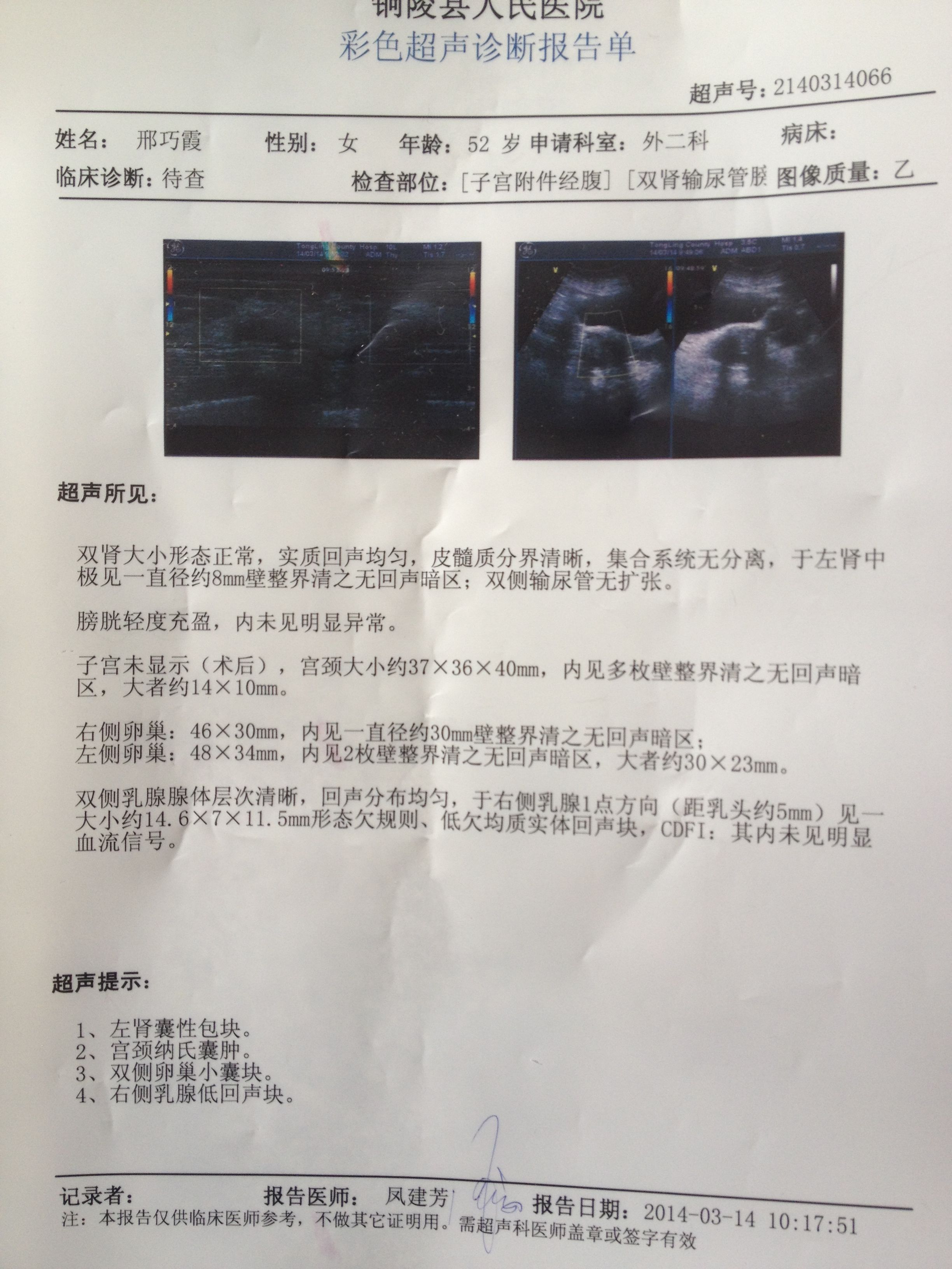 我妈8 9年前开过子宫肌瘤 子宫已经切除,2个乳房都开过乳房肌瘤,最近腰酸,小腹胀痛,人没劲 点击展开 匿名用户 2014-03-18 15:55 为您推荐: 其他回答 病情分析: 不知道你要问什么呢,怎么不舒服 指导意见: 现在来说就是注意复查下看看吧,没有什么好办法的 匿名用户 2014-03-18 16:48 相关问题 两年前做过子宫肌瘤手术,一个星期前小腹胀痛,腰酸,检查结果是多发性肌瘤,子宫增大,请问又要做手术吗 子宫肌瘤3 0最近腰酸很厉害,尿贫,人很疲劳,我想游泳锻炼,可不可以 本人40岁,月经周期23天,经期5天,特喜好运动,身体健康,无腰酸,痛经等症状,有2毫米子宫肌瘤,正常么