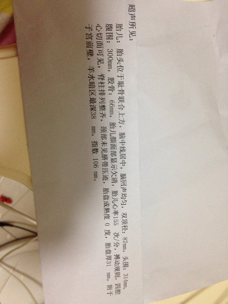 b超显示胎儿双顶径8.7cm,略微偏小,一般到足月应达到9.2cm左右;其余胎心率、羊水量都是正常的;胎盘现在是0级,还未成熟。