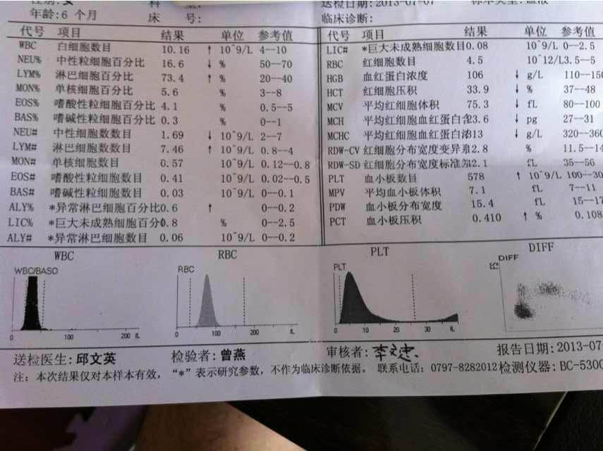 急,宝宝血液化验单,麻烦高手看看,谢谢 宝宝最近也没有感冒,不知道这个化验单显示的结果,严重不严重!!! 点击展开 匿名用户 2013-07-07 15:37 满意回答 不算严重,有些病毒感染了。 完颜念露_Hezo 2013-07-07 15:54 宝宝知道提示您:回答为网友贡献,仅供参考。 相关问题 哪位高手帮我看一下孕检血液化验单和四维彩超单子! 请高手看看我家宝宝血液化验单!4个月大了~有一点点咳嗽,今天发烧38 2度,请帮忙看下!! 请高手专家看看我家宝宝的便便化验单