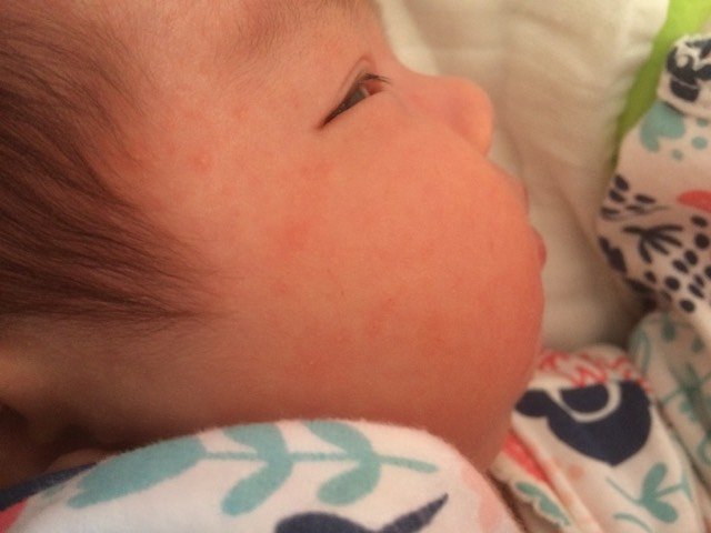 有没有人帮忙看下,宝宝这个长的是不是婴儿痤疮?红色的小疙瘩,有点白色的小头,退了之后摸着有小疙瘩
