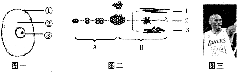 ③细胞核、在细胞核与细胞膜之间是细胞质.图二是细胞分裂和细胞分化图,A过程由一个细胞,变不成2个,由2个变成4个,因此A过程表示细胞分裂;B过程中细胞在形态、结构方面也发生了变化,各自具有了不同的功能,如1由长条状的肌细胞组成,有收缩舒张的功...能;2由较多突起的神经细胞,能接受刺激,产生兴奋.因此B过程是细胞分化,形成了不同的组织如1肌肉组织、2神经组织.3上皮组织.(1)科比?布莱恩特(图三)1978年生于美国宾夕法亚州,从一个受精卵到婴儿再到成年时的他,主要是经过了细胞生长、细胞分裂、细胞分化.图二中过程A主要是细胞数目增多,因此表示细胞分裂.B过程中细胞在形态、结构方面也发生了变化,各自具有了不同的功能如保护、营养、输导等功能,因此是细胞分化.细胞分化从而形成了不同的组织如1肌肉组织(由长条状的肌细胞组成)、2神经组织(神经元由细胞体和突起组成)、3上皮组织(排列紧密)、结缔组织(细胞间质较多).(2)细胞核是遗传物质储存和复制的场所、生命活动控制中心,是细胞的遗传信息库.因此科比肤色是黑色,主要是由图一中的位于细胞中央的