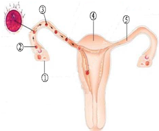 由女性生殖系统及排卵、受精和怀孕示意图可知: ①表示卵巢, ②表示卵细胞, ③表示受精卵, ④表示子宫, ⑤表示输卵管.(1) ①卵巢:女性主要的性器官,产生卵细胞和分泌雌性激素.(2) ⑤输卵管:输送卵细胞,精子和卵细胞结躬用沃合受精的场所.(3) ④子宫:胚胎和胎儿发育的场所.胎儿通过胎盘、脐带从母体获取所需营养物质和氧,并排出二氧化碳等废物.故答案为:(1) ①;卵巢;愿阶卵细胞;(2) ⑤;卵细胞抓密;(3) ④;子宫;胎盘.