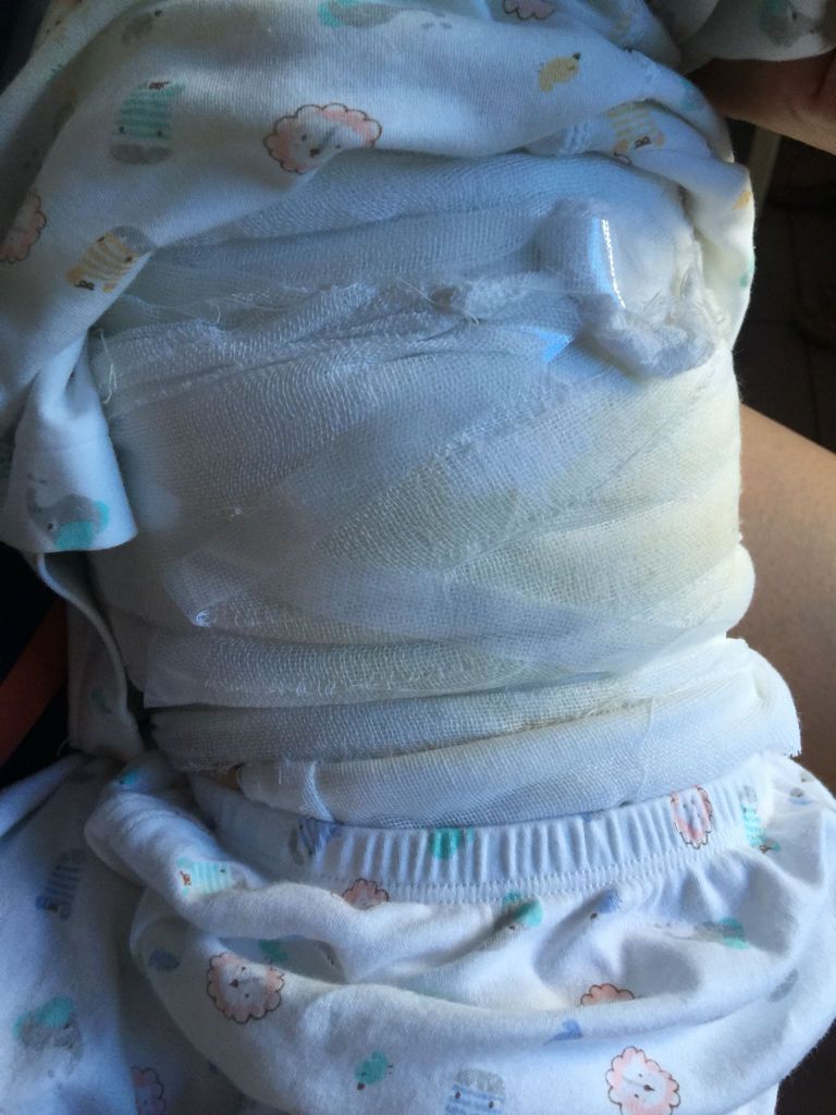 我小孩1岁零3个月(女)。早上一不小心把盛面汤的碗打到了,洒了一点到肚皮上,马上带到一个烧伤烫伤专科医院(私人的),一开始在家里小孩肚子被烫的地方上面脱了皮,在家里就涂了《美宝、湿润烧伤膏》第四张照片!前面两个药是医院开的,非要要求在医院住院,说明要观察!(怕小孩发烧,抽搐,痉挛等现象)疫苗记录本上15年11月打了百白破育苗(前后一共三次)就没要求我们打破伤风疫苗了!!想问问网友 这样包着伤口(半个巴掌大的伤口)天气30多度,合适吗?怎么样可以不要留下疤痕?家人坚持去市人民中心医院不想在这私人医院治疗,有什么区别吗?有后遗症的可能性大吗?有什么好的药物可以推荐吗?谢谢大家了。。