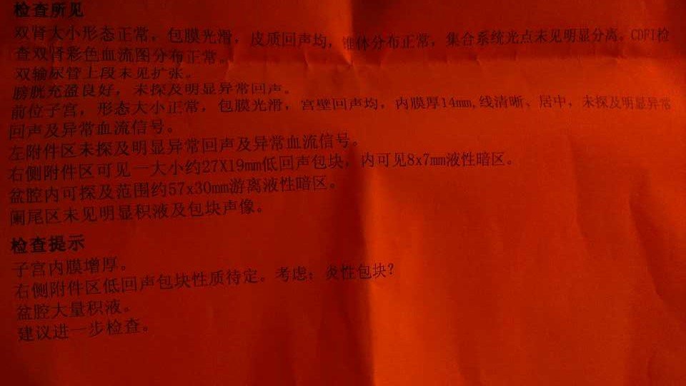 盆腔内积液 具体看图片 突发性腹痛去检查才发现 一年前自然分娩生过小孩 生小孩后 最近2个月才来月