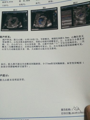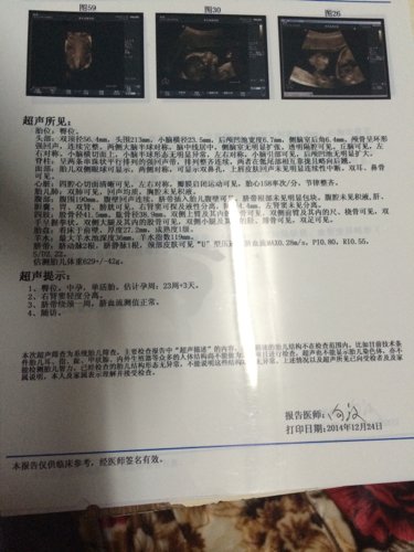 我老婆怀孕23周+3天,今天检查四维结果出来了,报告单上的超声所见很多看不懂,超声提示里面有个东西 我老婆怀孕23周+3天,今天检查四维结果出来了,报告单上的超声所见很多看不懂,超声提示里面有个东西让我很害怕 右肾窦轻度分离 这是什么意思呢?下面有图 谢谢你们了,在线等 点击展开 匿名用户 2014-12-25 19:11 为您推荐: 其他回答 你好,胎儿肾盂扩张不超过0.7厘米属于正常的,要是超过0.7厘米不超过1.5厘米属于观察期,超过1.5厘米那就是轻度肾积水了 天使7737 2014-12-25 19:50 相关问题 请大家帮忙看看四维彩超报告单 宝宝正不正常 超声所见:胎位,未定可见胎动 BPD60mm,FL43mm… 我老婆怀孕十三周今天做彩超,超声所见:增大宫腔内见胎儿回声,双顶径24mm,可见胎动及胎心节律搏动 怀孕六周超声所见:子宫前位,增大,宫腔内见两个妊娠囊19*12*22mm,22*8*24mm,其内