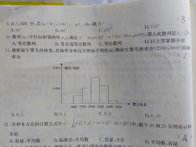 高一数学 第9-11提 观察新生婴儿的体重,其频率分布 点击展开 匿名用户 2015-08-31 10:24 为您推荐: 其他回答 300×0.001=0.3 匿名用户 2015-08-31 10:27 0.001*300=0.3,选C 匿名用户 2015-08-31 10:27 相关问题 观察新生婴儿的体重,分布直方图如下图所示,则新生婴儿的体重在[2700,3000)的频率为 为监测幼儿身体发育状况,某幼儿园对“大班”的100名幼儿的体重做了测量,并根据所得数据画出了频率分布 新生婴儿满月生下,身高45公分,体重2 15公斤是否正常?