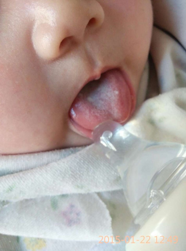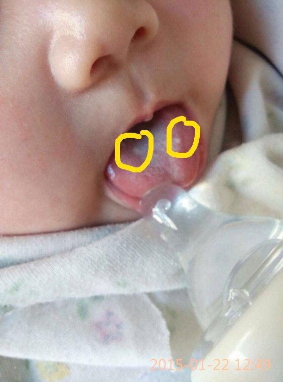 急需专业回答!我的宝宝三个半月了,昨天突然发现舌头上有白点,靠近舌根的地方多,前面能看见两个,因为宝宝小,掰不开嘴也不敢使劲掰,他也不张嘴,勉强照了照片,哪位高手帮忙看下是什么东西呢?是不是鹅口疮呢?好担心啊!现在感觉好闹心!
