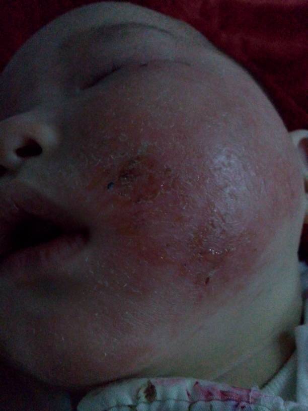 跪求良药 这是宝宝左脸的照片 求求医生了,宝宝睡也睡不着,吃也吃不好,嗓子都哑了 宝宝四个月了